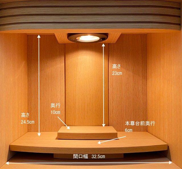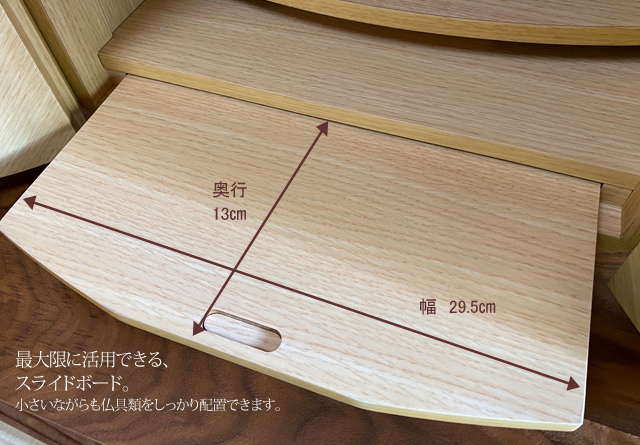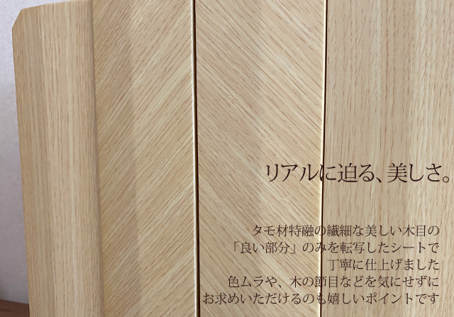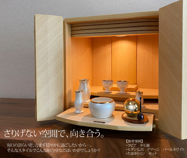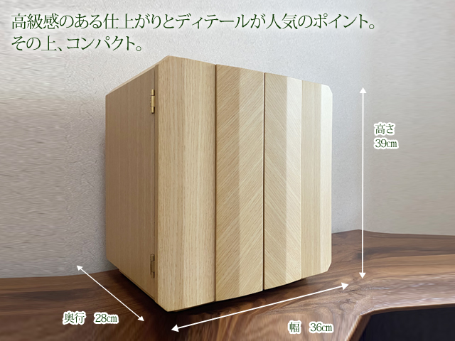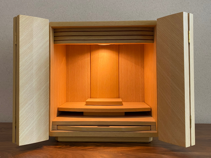 美しく繊細なタモ材を転写したシートを使い、コンパクトでも存在感のあるミニ仏壇
