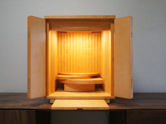 シンプルながらも、その繊細で美しいデザインは他のモダン仏壇とは全く違う印象を与えてくれます。素材であるカーリーメープル材のやわらかな木目を自然に愛でていただけるような自然な仕上がりは国産ならではの丁寧な仕事があってこそ…です。
