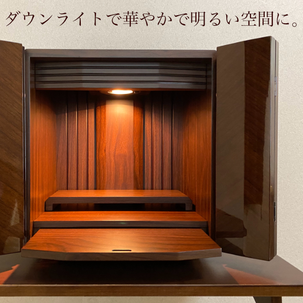 扉は全面ではなく、中央部分のみの光沢仕上げ。上品な光沢がお仏壇本体の高級感もアップしてくれます。