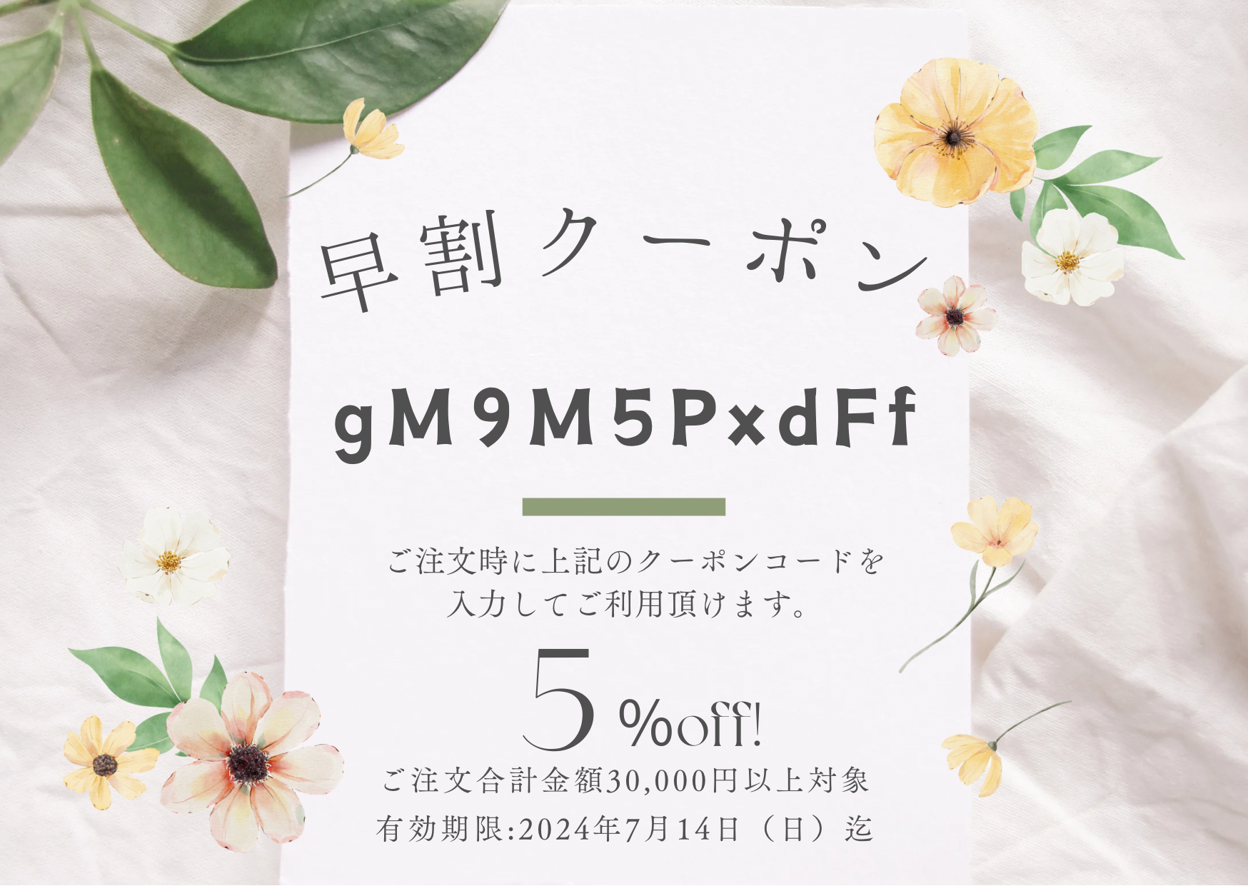 上記クーポンコードをコピペしてご利用頂けます。ご注文金額30,000円以上対象にてさらに5%引きをさせていただきます。この機会にぜひご利用ください。