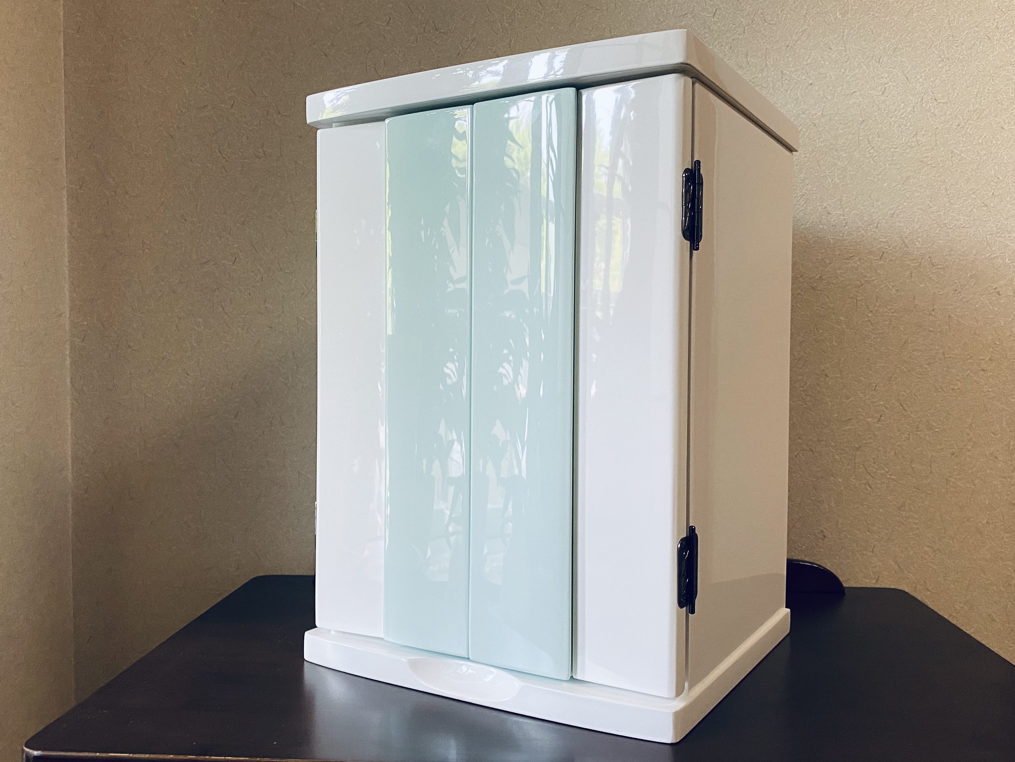 真っ白を基調にした光沢のある仕上がりのモダンミニ仏壇 クレール グリーン。正面扉には淡いグリーンを配色してモダンで明るい印象のお仏壇です。